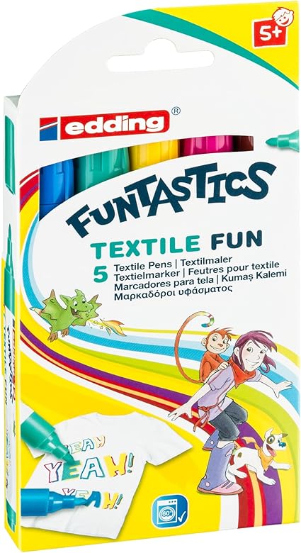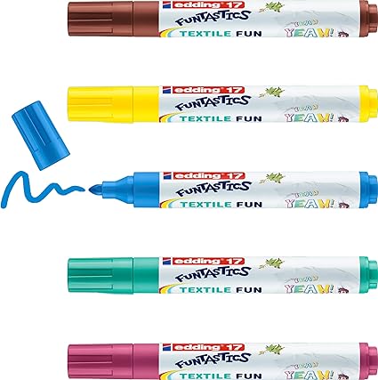 17 FUNTASTICS TEXTILE FUN çocuklar için tekstil kalemi – sarı, kahverengi, mavi, kırmızı, yeşil – 5’li kalem seti – 2-3 mm yuvarlak uç
