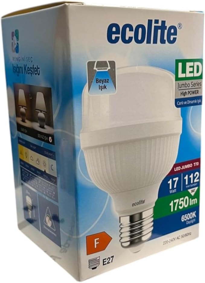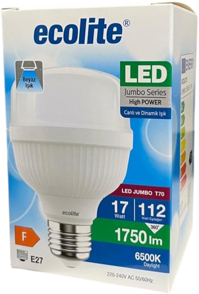 17W Jumbo LED Ampul (112W Eşdeğer) 6500K Beyaz Işık – E27 Duy, 1750 Lümen, 220V, Enerji Sınıfı F, 109x70mm17W Jumbo LED Ampul (112W Eşdeğer) 6500K Beyaz Işık – E27 Duy, 1750 Lümen, 220V, Enerji Sınıfı F, 109x70mm