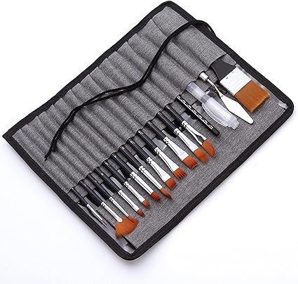 18 adet boya fırçası seti 12 çeşit boya fırçası, 1 kazıyıcı, 1 sarı sünger top, 1 2B kurşun kalem, 1 Suluboya fırçası kalem ve kanvas saklama çantası ile birlikte gelir.