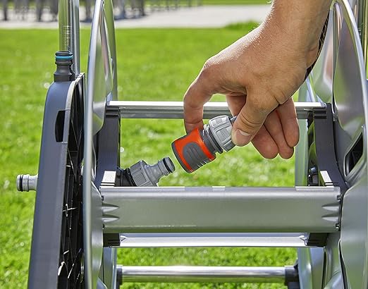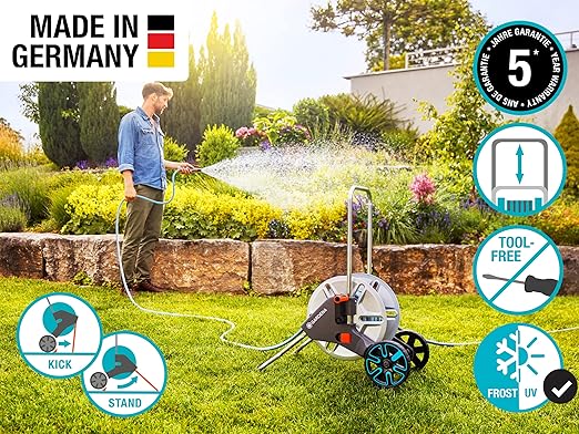 Özel olarak şekillendirilmiş katlanır ayak, yüksek ayakta durma güvenliğini garanti eder. Bu, hortum çekildiğinde bile hortum arabası yerinde kaldığı için sulama işini kolaylaştırır.