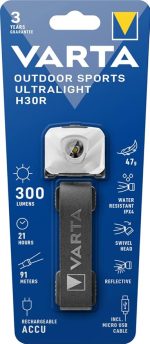 Teslimat kapsamı: VARTA Outdoor Sports Ultralight H30R beyaz + 1 m Mikro USB şarj kablosu + montaj klipsi
