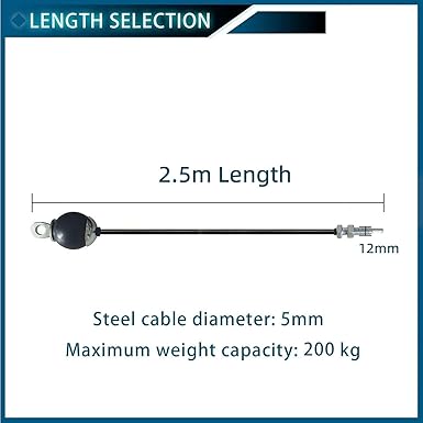 Kablo çapı: 5 mm, maksimum ağırlık kapasitesi: 100 kg, vida dişi çapı: 12 mm, metal halka çapı: 11 mm