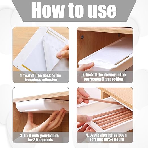 【Kolay kurulum】 Alt yapı çekmecesi güçlü kendinden yapışkanlı yapıştırıcı ile donatılmıştır. Çift taraflı yapışkan bandın plastik folyosunu çıkarın ve istediğiniz yere yapıştırın. En iyisi 24 saat stabilizasyondan sonra kullanın. En iyi kurulum etkisini elde etmek için yapıştırmadan önce çekmecenin altındaki tozu çıkarmanız önerilir.