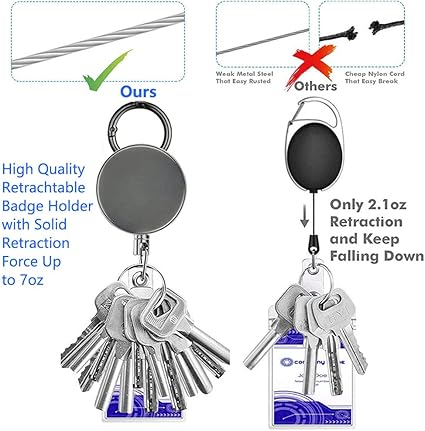 【Geri Çekilebilir Çelik Kablo Anahtarlık】Bu geri çekilebilir uzatılabilir rozet tutucusu, piyasadaki diğer geri çekilebilir kimlik tutucular için 85 g/3 oz’a kıyasla maksimum 150 g/5.3 oz yük ağırlığına sahiptir. Geri çekilebilir karabina rozet tutucusu, pantolonlara, kemerlere veya sağlam çantalara yapışmayı daha güvenli hale getiren cıvatalı bir arka klips tasarımına sahiptir. Geri çekilebilir rozet tutucusu, kimliğinizi taşımanın ve gözünüzün üzerinde tutmanın kolay bir yolunu sağla