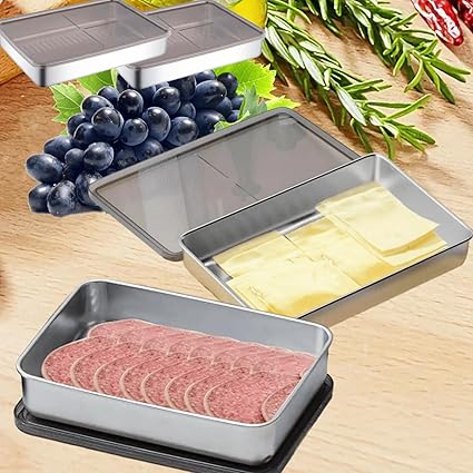[Kapaklı Buzdolabı Saklama Kapları]: Bu Paslanmaz Çelik Gıda Kapları ile peynirinizi veya tereyağınızı uzun süre taze tutun. Buzdolabı düzenleyicisinin altındaki yükseltilmiş yapı, yiyeceklerin kabın dibine yapışmasını önler. Kapak toz geçirmezdir ve yiyecekleri temiz tutar ve sizin için en iyi saklama ortamını yaratır