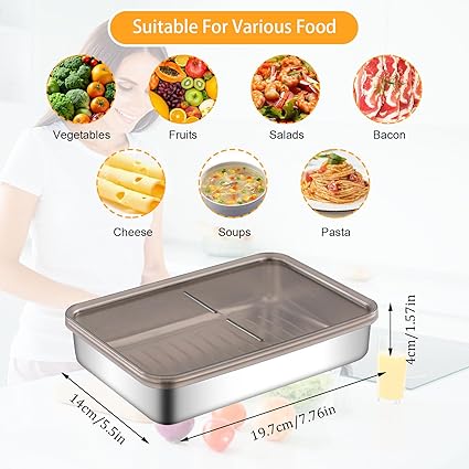 [Yerden Tasarruf]: Paslanmaz Çelik Gıda Saklama Kapları küçük porsiyonlarda peynir, sosis ve sandviç saklamak için kullanılır, boyutu 19,7* 14* 4 cm’dir (7,76* 5,5* 1,57 inç), boyut peynir, tereyağı ve şarküteri gibi kare yiyecekleri saklamak için mükemmeldir, istiflenebilir tasarım buzdolabında daha fazla yer tasarrufu sağlar