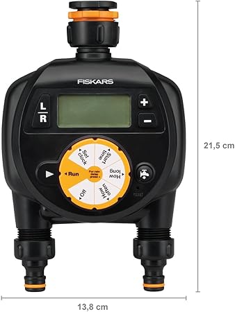 Teslimat kapsamı: 1 x Fiskars zamanlayıcı/zamanlayıcı, 2 çıkışlı, 2 x AA pil teslimat kapsamına dahil değildir, Ölçüler: (UxGxY): 6,48 x 13,8 x 21,5 cm, Ağırlık: 580 g, siyah/turuncu, 1054792