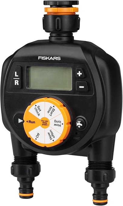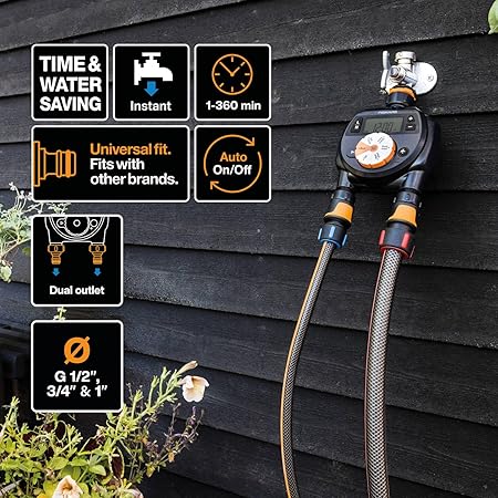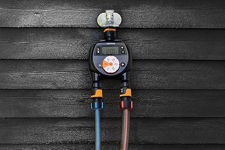 2 hortumu bağımsız veya aynı anda çalıştırmak için kolay ayarlanabilir zamanlayıcı, zayıf pil durumunda sulama durdurucu (2 x AA pil teslimat kapsamına dahil değildir)