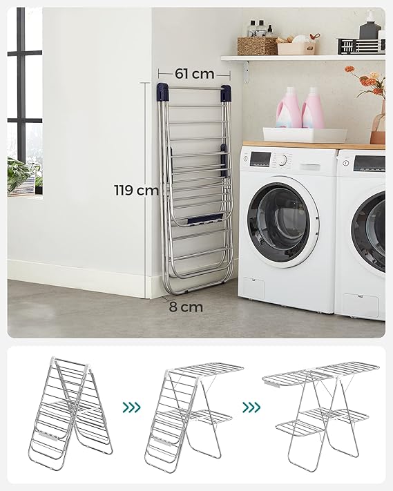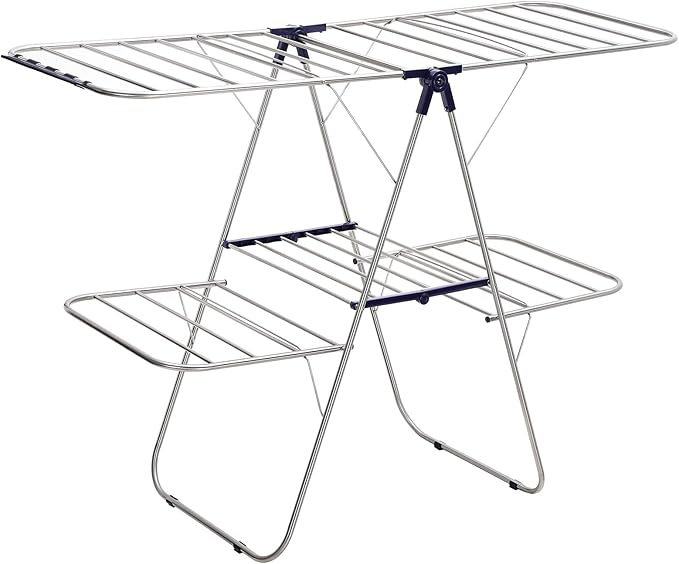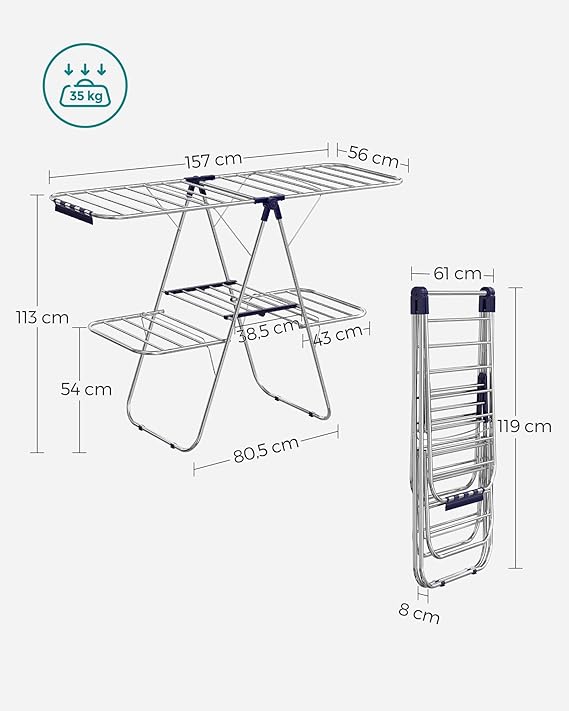 Ne elde edersiniz: Paslanmaz çelikten yapılmış ve taze çamaşırları kurutmak için bol miktarda alan sunan 2 seviyeli bir çamaşır rafı Kullanmazsanız, kolayca katlayabilir ve alanı istifleyebilirsiniz