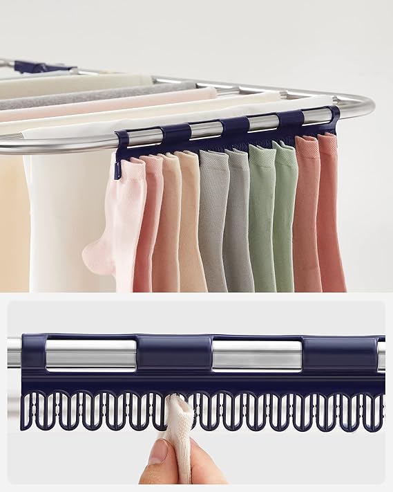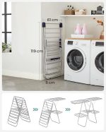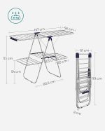 Bu çamaşır rafı, çamaşır yıkamak için 2 seviyede 33 çubuk ve 27 çorap klipsine sahiptir Buna ek olarak, üst kanatlar yükseklikte ayarlanabilir, böylece uzun kıyafetleri de asabilirler