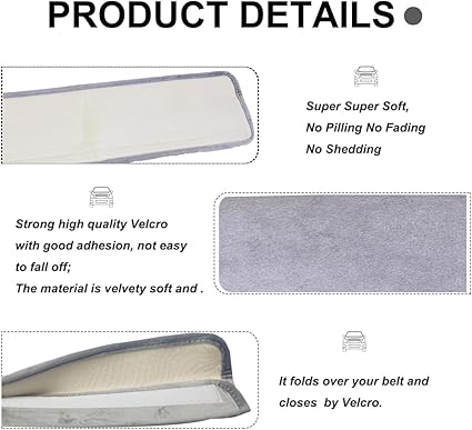 Süper yumuşak, tüylenme yapmaz, solmaz, dökülmez: Güçlü, yüksek kaliteli cırt cırtlı, iyi yapışır, kolay düşmez; malzeme kadifemsi yumuşaklıktadır ve. Göğüs ve boyunda emniyet kemerinizden daha iyi hissettirir. Kemerinizin üzerine katlanabilir ve cırt cırt ile kapatılabilir.
