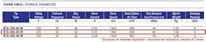 Akım: 0,25 A / Güç: 50 W / Elektrik / Voltaj: Monofaze / 220 V / Frekans: 50 Hz / Devir: 1400 D/D