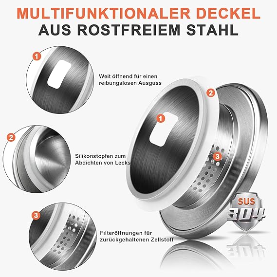 Ev yapımı içecekler için geliştirilmiştir: Bu cam sürahi, isteğe göre ayarlanabilen iki delikli 18/8 paslanmaz çelik kapakla birlikte teslim edilir, böylece posa ve buz küplerini kolayca saklayabilir veya içecekleri hızlı bir şekilde dökebilirsiniz. Damlamaya dayanıklı dökme ağzı ve ergonomik sap sayesinde dökmeyi çocuk oyuncağı haline getirir ve kapağın etrafındaki gıda maddelerine uygun silikon, tezgahın ıslanmasını önlemek için demliğin gövdesine sıkıca oturur