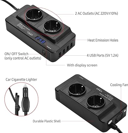 Akıllı telefon, dizüstü bilgisayar, tablet, araba navigatörü, kamera, elektrikli tıraş makinesi, hoparlör, TV, fan, ışık vb. için uygun 2 AC çıkış (AC 220V±%10) ve 4 USB bağlantı noktası (5V 1.2A) ile.