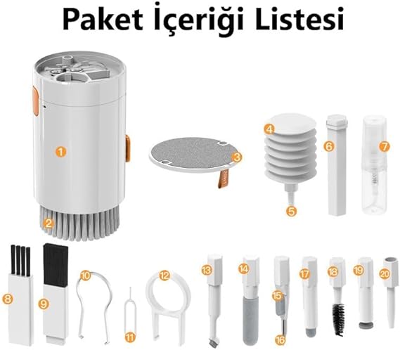 [Çok Amaçlı Temizlik Kiti 20 in 1]: Elektronik temizlik seti, Metal uçlu temizleme kalemi, Sünger Fırça,Mini Yumuşak Fırça, Yuvarlak Fırça, Klavye Fırçası, Tuş Takımı Çıkarıcı, Anahtar Çıkarıcı, Sprey Şişesi, Fiber Keçeli Bez, Uzun ve Kısa Başlıklı Hava Üfleyici, Yumuşak Pedli Lens Temizleme Kalemi, Sert Kıllı Fırça ve Yumuşak Kıllı Fırça ve Bir Kart Çıkarıcı İçerir. Dizüstü Bilgisayarları, Klavyeleri, Kulaklıkları, Ekranları, Telefonları vb. etkili bir şekilde temizleyebilir.