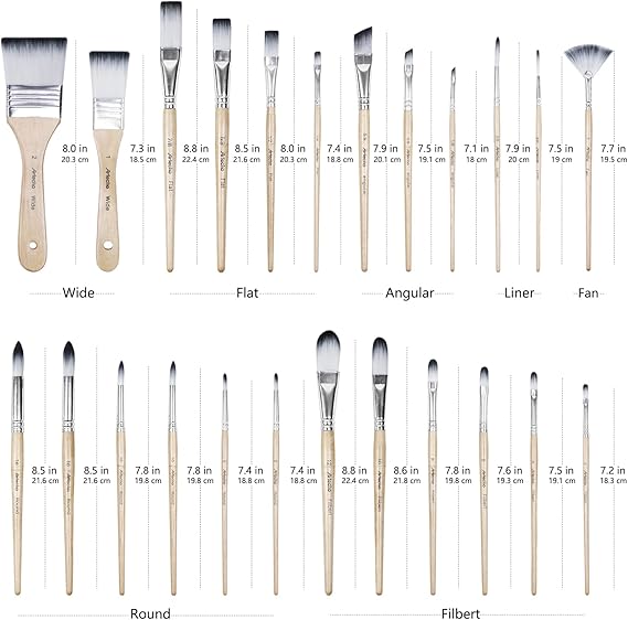 Farklı boyutlarda boya fırçaları: Boya fırçası 3/0, 2/0 yuvarlak astar, 0/10/16 Yuvarlak, 1/8, 3/8, 5/8 Açılı, 1/4, 1/2, 5/8, 7/8 Düz, 2, 4, 6, 8, 10, 12 Filbert, 5 Fan, 1″, 2″ W. ide. İhtiyacınız olan tüm boyutları sağlamak istiyoruz