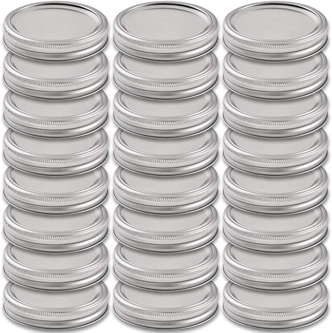 Paket – 24 set geniş ağızlı cam kavanoz kapakları ve bantları ile toplu, 24 kapak ve 24 bant içerir.