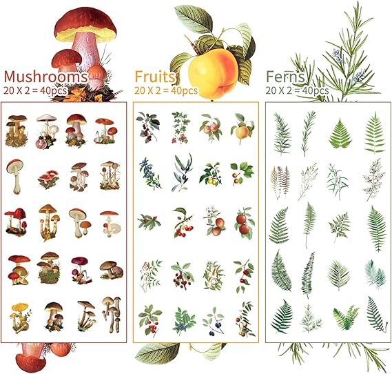 * (Süper Değer Paketi) * Bu bitki çıkartması paketi paraya değer, 6 tema içerir (bir tema için bir paket): Mantarlar, Meyveler, Eğrelti Otları, Çiçekler, Çiçek Dalları ve Yeşil Yapraklar. Her paket için 20 stil, her stil için 2 yaprak, yani paket başına 40 yaprak (toplam 240 yaprak).