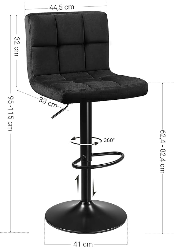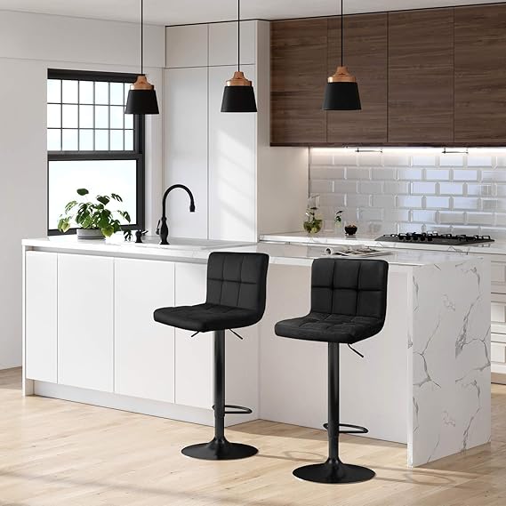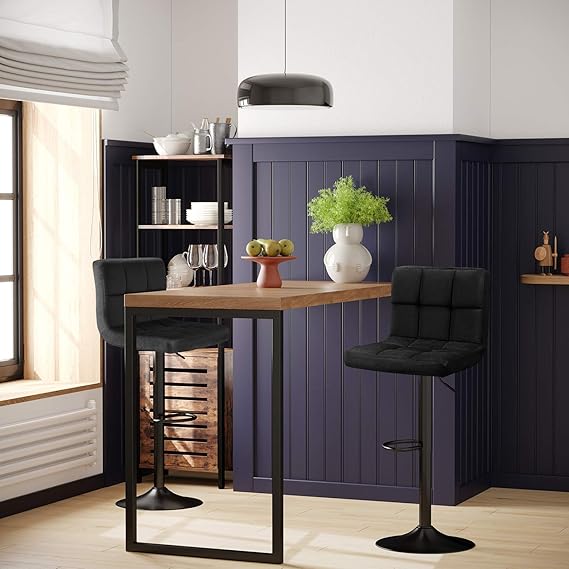 2Li Set Kadife Bar Tabureleri, Yüksekliği Ayarlanabilir Döner Tabureler, Mutfak Sandalyeleri, Sırtlık ve Ayaklık, Metal, Siyah Ljb014B01