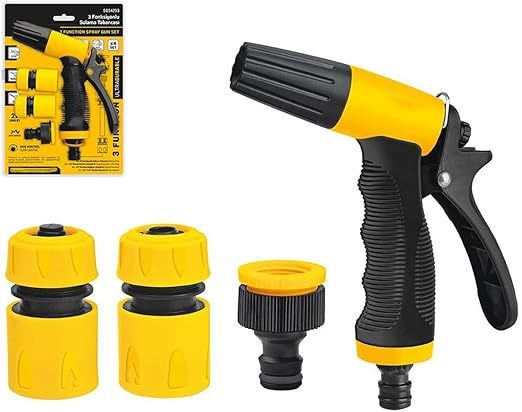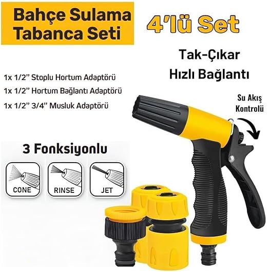 3 Fonksiyonlu Sulama Tabancası 4 Parça Set, Bahçe Sulama, Araç Yıkama, Dış Mekan Temizliği, Çok Amaçlı Yüksek Malzeme Kalitesi, Tak-Çıkar Hızlı Bağlantı Ayarlı Hortum Tabancası