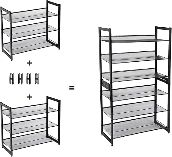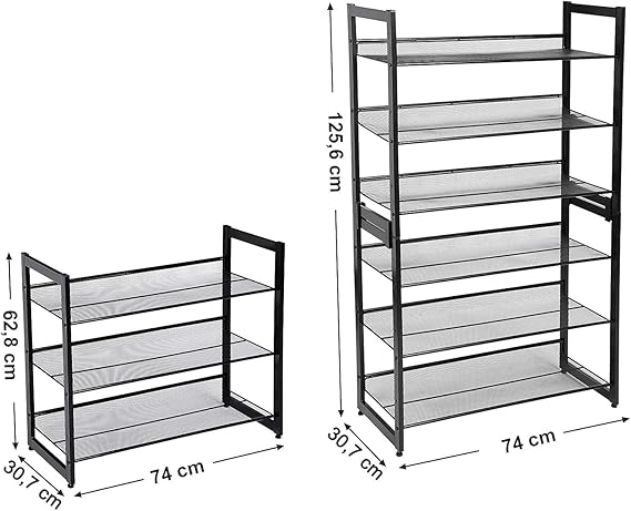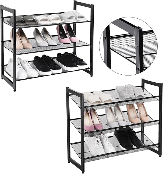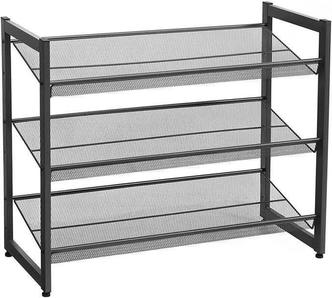 3 Katlı Metal Ayakkabı Rafı, Fileli Raf, Ayarlanabilir Koyma Alanlı Düz veya Açılı Raf Zeminleri, Koridor, Giriş Alanı İçin Istiflenebilir Depo Rafı, 74×62,8×30,7 cm, Siyah, Lmr03B
