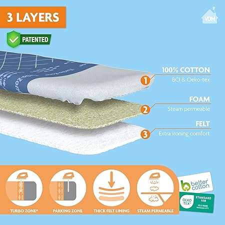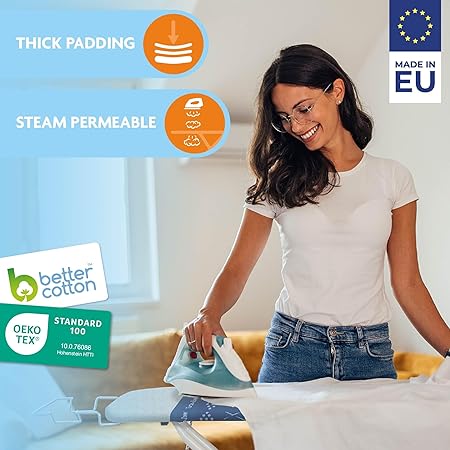 Üç katmanı ile bu ütü masası kılıfı kıyafetlerinizi ütülerken rahat bir döşeme etkisi sunar. Molton ve köpükten ekstra kalın alt katmana sahip %100 BCI pamuktan üretilmiştir