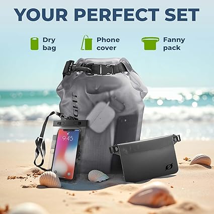 3 Su Geçirmez Torba Seti Dry Bag (Antrasit) – 10L su geçirmez torba + cep telefonu için su geçirmez kılıf + su geçirmez bel çantası | IPX8 koruma | Plajda ve ayakta kano yapma için