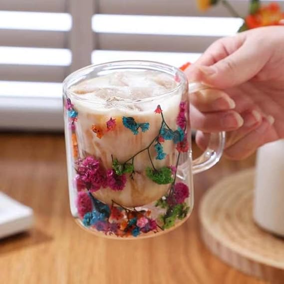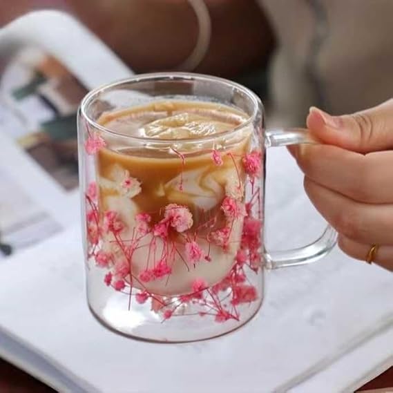 300ml Çift Cidarlı Çiçekli Kupa – Isıya Dayanıklı Çift Katmanlı Cam Çay & Kahve Kupası | Şık ve Ergonomik Tasarım