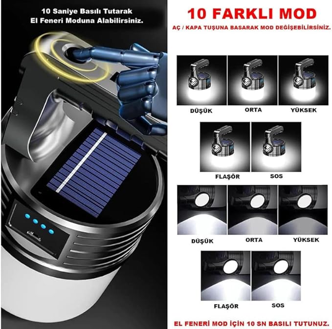 Kamp Lambası, Solar Kamp Fener, El Feneri, El Lambası, Çadır Lambası, USB İle Şarj Edilebilir, Dış Mekan, Yürüyüş, Acil Durum, Kamp Feneri, Taşınabilir Şarj Cihazı (Siyah)
