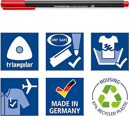 Rahat ve kolay yazım için ergonomik üçgen gövde tasarımı. 60 farklı renk seçeneği. DRY SAFE Kapak günlerce açık kalsa bile kuruma yapmaz (neon renkler hariç). MIX&MATCH – Farklı uç kalınlıklarında renk tonu değişmeden kullanım imkanı . Çizgi kalınlığı yaklaşık 0.3 mm Su bazlı mürekkep.Birçok tekstil kumaştan yıkanınca kolayca çıkar. Almanya üretimi ‘Made in Germany’.