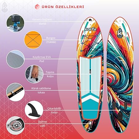 Malzeme ve Teknoloji: Karfe UV Shield teknolojisi ile güçlendirilmiş, damla dikiş (Drop Stitch) PVC teknolojisi ve çift katmanlı (Double-layer) PVC yapıştırma tekniği ile üretilmiş. İç katman PVC kalınlığı 0.52mm, dış katman PVC kalınlığı 0.7mm, EVA pad kalınlığı 3mm’dir.