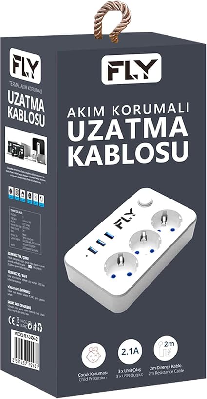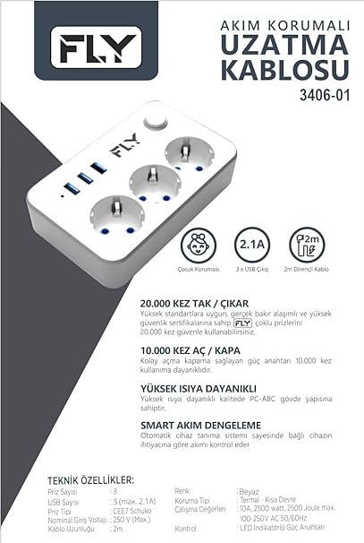 3406 Termal Akım Korumalı, Çocuk Korumalı, 3 X USB, 2Mt Uzatma Kablosu 3nanlü Priz, Beyaz