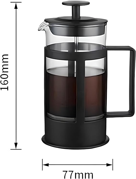 350 ml Cam French Press + Ölçü Kaşığı – Isıya Dayanıklı Cam, Paslanmaz Çelik Filtreli, Siyah Renkli Kahve ve Bitki Çayı Demliği