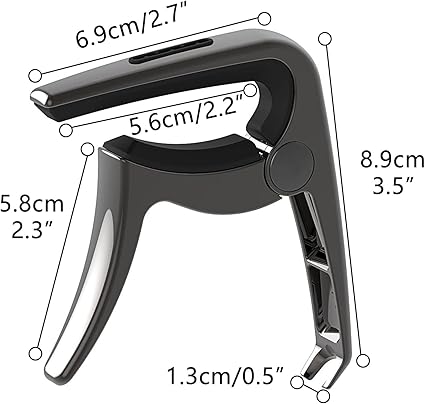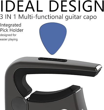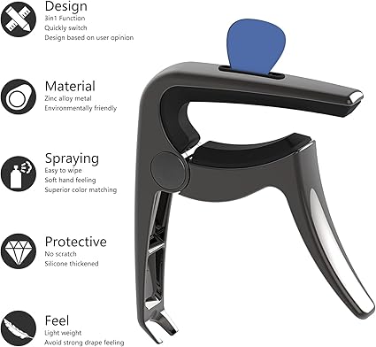 3’ü 1 arada tasarımcı gitar capo, capo, gitar pimi çekicisi ve 3’ü 1 arada pikap tutucu için işlevsel. Daha kolay erişim için tasarlanmış güzel görünümlü seçme yuvası.