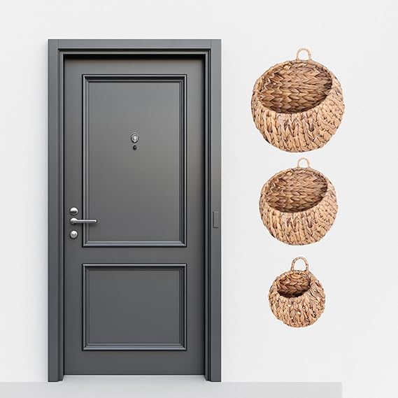 3’lü Asılabilir El Yapımı ve Doğal Yuvarlak Hasır Dekoratif Mektupluk ve Anahtarlıjk Seti, 3’lü Hasır Yuvarlak Saksı Seti, Hasır Kapı Süsü 3’lü Set