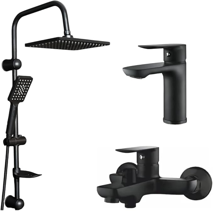 3’lü Modern Banyo Seti, Robot Duş Başlığı, Lavabo ve Banyo Bataryası, Siyah Krom (Siyah nero fleko 3 lü set)