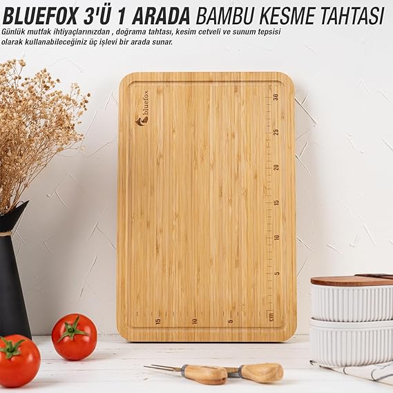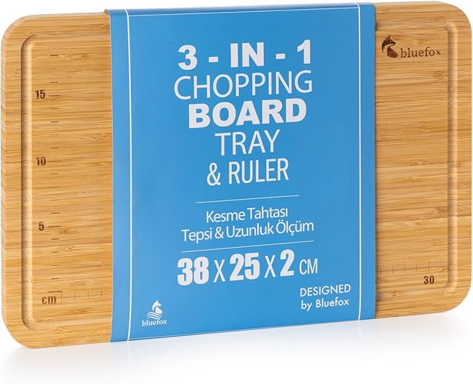 Çok Fonksiyonlu Tasarım: Bluefox 3’ü 1 Arada Bambu Kesme Tahtası, doğrama tahtası, kesim cetveli ve tepsi olarak kullanabileceğiniz üç işlevi bir arada sunar.