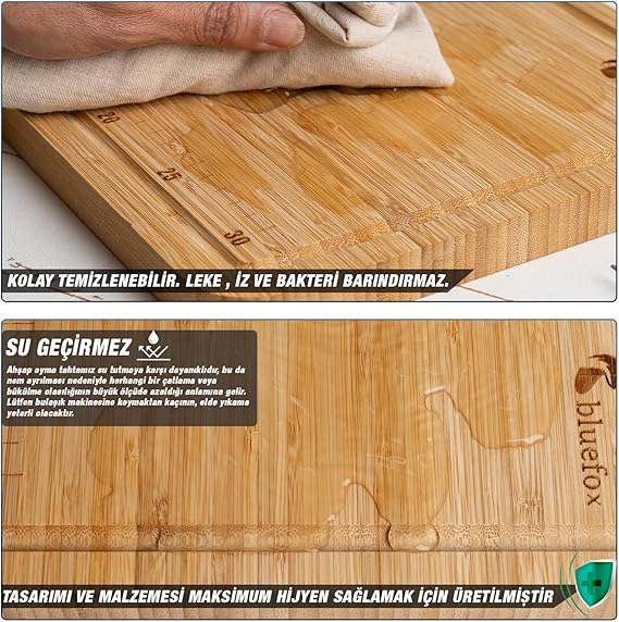 Bıçak Dostu Yüzey: Bluefox Bambu Kesme Tahtası, bıçaklarınızın keskinliğini korur ve uzun süreli kullanımı destekler.