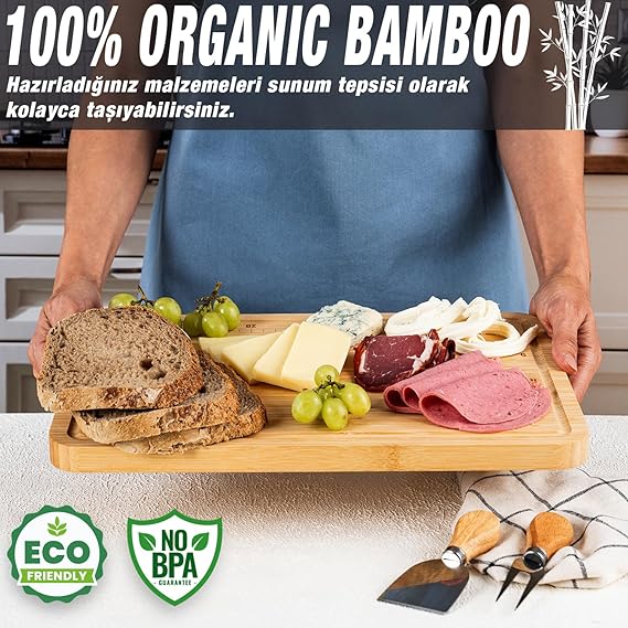 3’ü 1 Arada Bambu Kesme Tahtası: Doğrama Tahtası, Kesim Cetveli ve Tepsi Fonksiyonlarıyla Mutfakta Pratik Çözüm,Su Oluklu, Bıçak Dostu, Neme Dayanıklı Yüzey, 38×25 cm