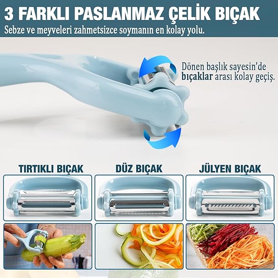 Keskin Paslanmaz Çelik Bıçaklar: Düz bıçak, tırtıklı bıçak ve jülyen bıçak olmak üzere üç farklı paslanmaz çelik bıçak içerir. Bu sayede sebzeleri ince ince dilimleyebilir, meyveleri pürüzsüz şekilde soyabilirsiniz.