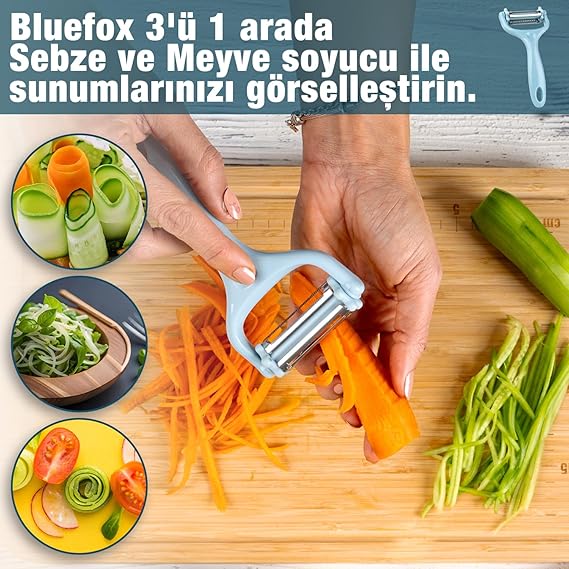 Üçü Bir Arada Tasarım: 3’ü 1 Arada Patates Soyucu, farklı sebze ve meyveleri zahmetsizce soymanızı sağlayan çok yönlü bir mutfak gerecidir. Havuç, patates, kabak gibi sert sebzelerden narin meyve kabuklarına kadar her türlü soyma işlemini kolaylaştırır.