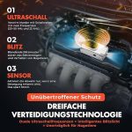 3’ü 1 arada sansar korkutucu, ultrason ve alışma önleyici etki, yakl. 100 m² için. Kızılötesi sensörlü ve 3 kat korumalı sansar kovucu. Otomobil, tavan arası, ev, garaj, kiler, bahçe kulübesi