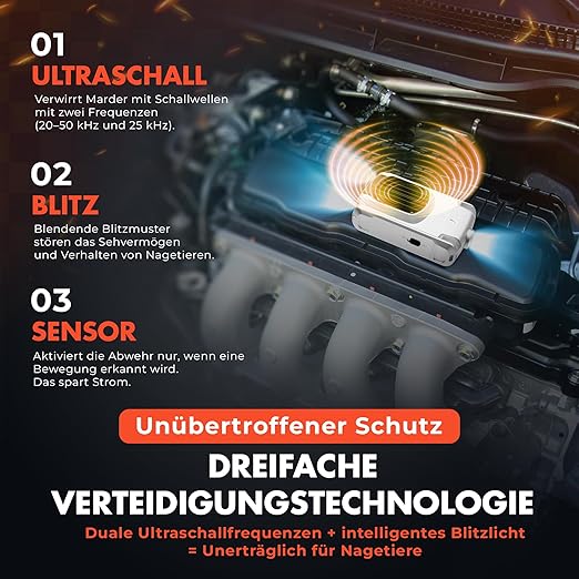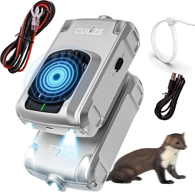 ✅ Hayvanları korur ve gürültüsüz: Sansarları ve kemirgenleri doğal bir şekilde onlara zarar vermeden uzaklaştırır. İnsanlar tarafından duyulmayan ultrasonik frekanslar, evcil hayvanlar ve araç elektroniği için güvenlidir. Sansar spreyi veya tuzaklara insancıl bir alternatif – bakım gerektirmeyen saf teknik çözüm.