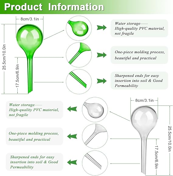 Sağlıklı bitkiler yetiştirin – Bu 4 dekoratif PVC sulama küresi seti, küçük iç ve dış mekan bitkileriniz için mükemmel bir otomatik sulama sistemidir. Artık bitkilerinizi sulamaya gerek yok! Kendi kendine sulama ampulleri, çiçekleri, otları ve diğer bitkileri beslemek için gereken mükemmel miktarda suyu yavaşça toprağa bırakır.