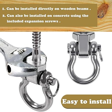 Yüksek kaliteli malzemeler: Salıncak montaj seti, sağlam ve dayanıklı, korozyon önleyici ve pas önleyici yüksek kaliteli paslanmaz çelikten yapılmıştır ve uzun süreli kullanım için iç ve dış mekanlarda monte edilebilir.
