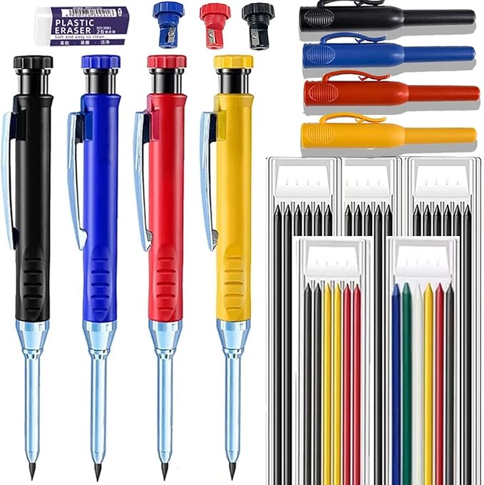Profesyonel ihtiyaçları karşılamak için 4 marangoz kalemi: Set, marangozlar veya ressamlar için özel olarak tasarlanmış 4 katı marangoz kalemi (siyah, mavi, kırmızı, sarı) içerir, bu da marangozlar ve mimarlar gibi profesyoneller için ideal bir seçimdir.