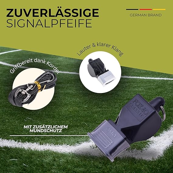 Temiz ve rahat bir kullanım için hakem düdüğü siyah bir boyun askısı ile donatılmıştır.