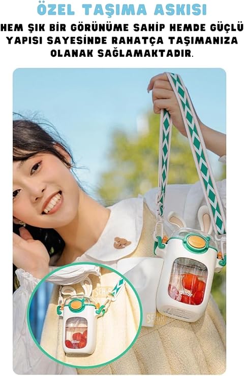 400ml Sevimli Tavşanlar Kulaklı Askılı Pipetli Tritan Çocuk Su Matarası (Beyaz)
