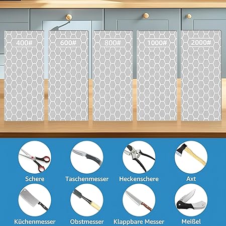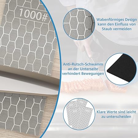 Hassas bileme için yüksek kaliteli elmas zımpara plakaları: 200# ila 2000# arası granülasyonlu 5 parçalı set, bal peteği yapılı uzun ömürlü elmas plakalardan oluşur. Endüstriyel elmas kaplama, uzun yıllar kullanım için yüksek aşınma direnci ve korozyon direncini garanti eder.