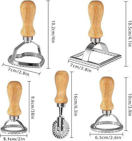 5 adet paslanmaz çelik ravioli kesici, ravioli kesici şekillendirici, ahşap saplı mantı şekillendirici, ravioli damgası, paslanmaz çelik ravioli kurabiye kalıbı, ravioli, makarna, köfte aleti için